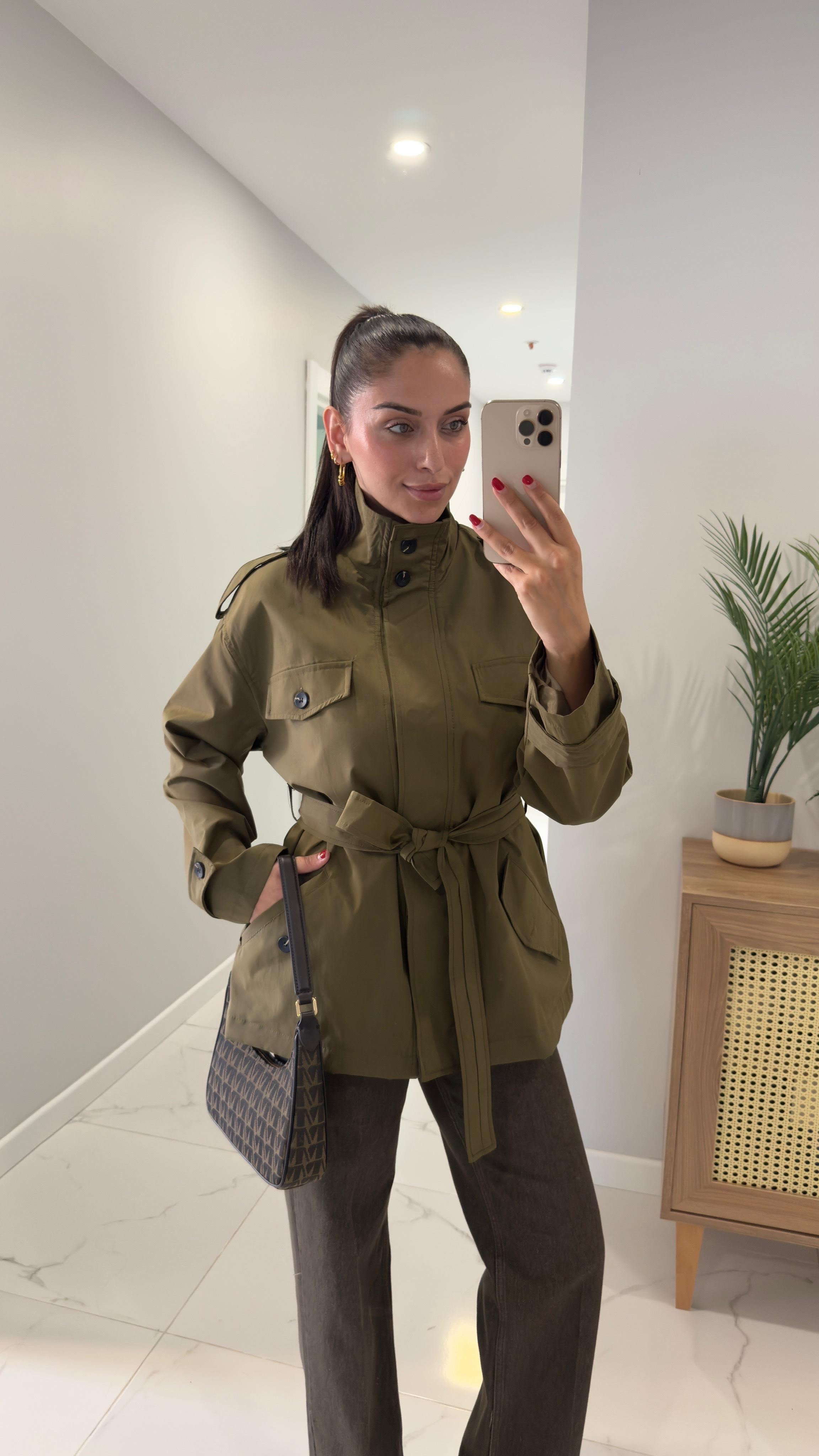 Amara Haki Düğme Detaylı Kuşaklı Kısa Trençkot