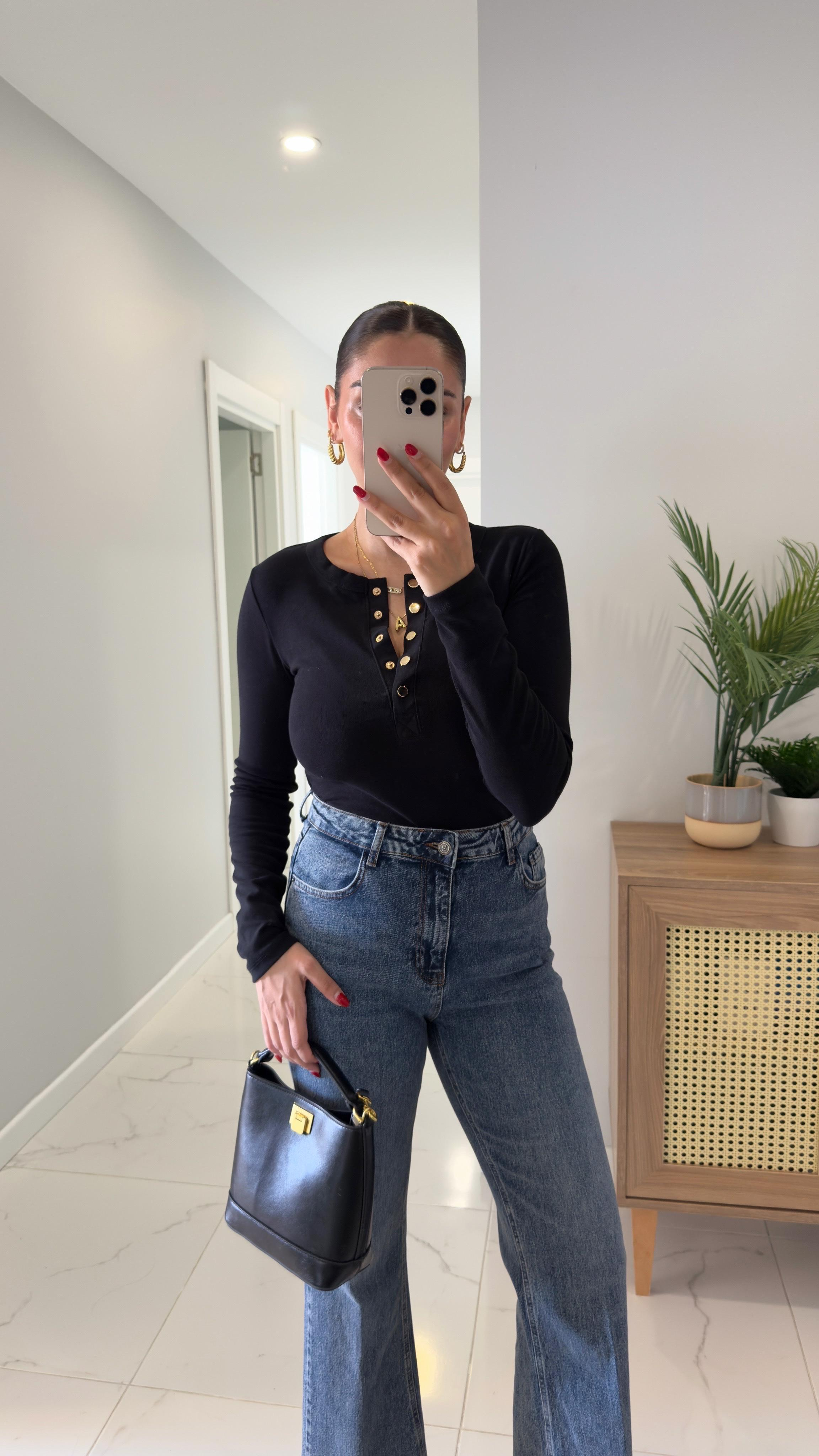 Benry Siyah Çıtçıt Detaylı Uzun Kol Bluz (BLZ111-SYH)