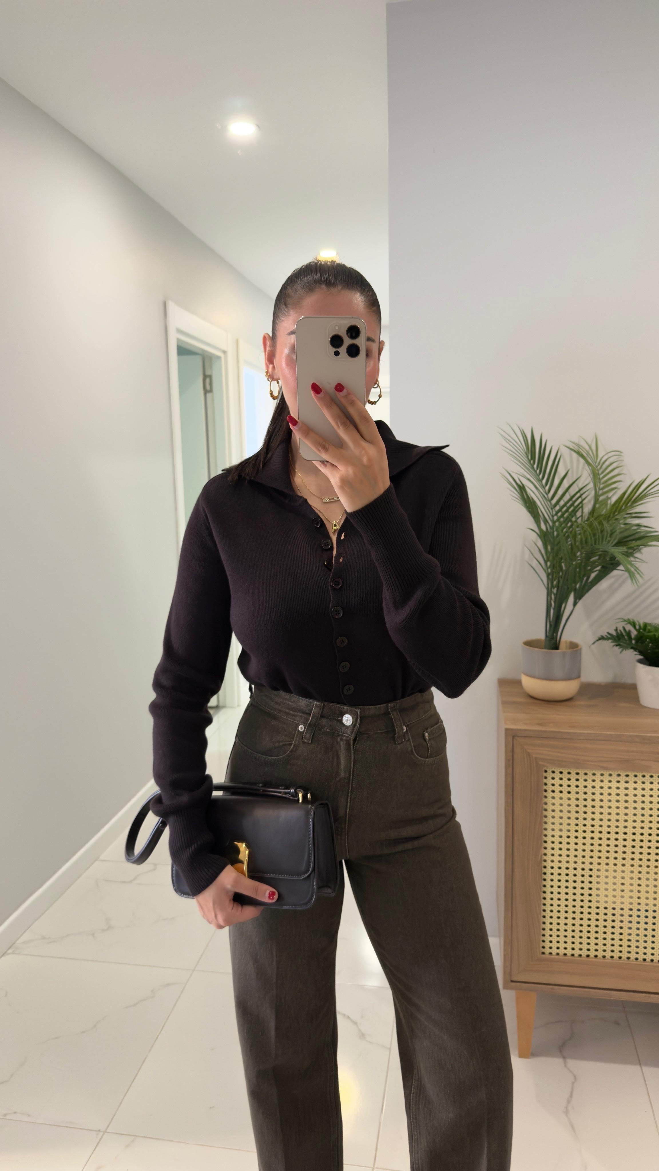 Dilvin Cleo Koyu Kahve Polo Yaka Düğmeli Triko
