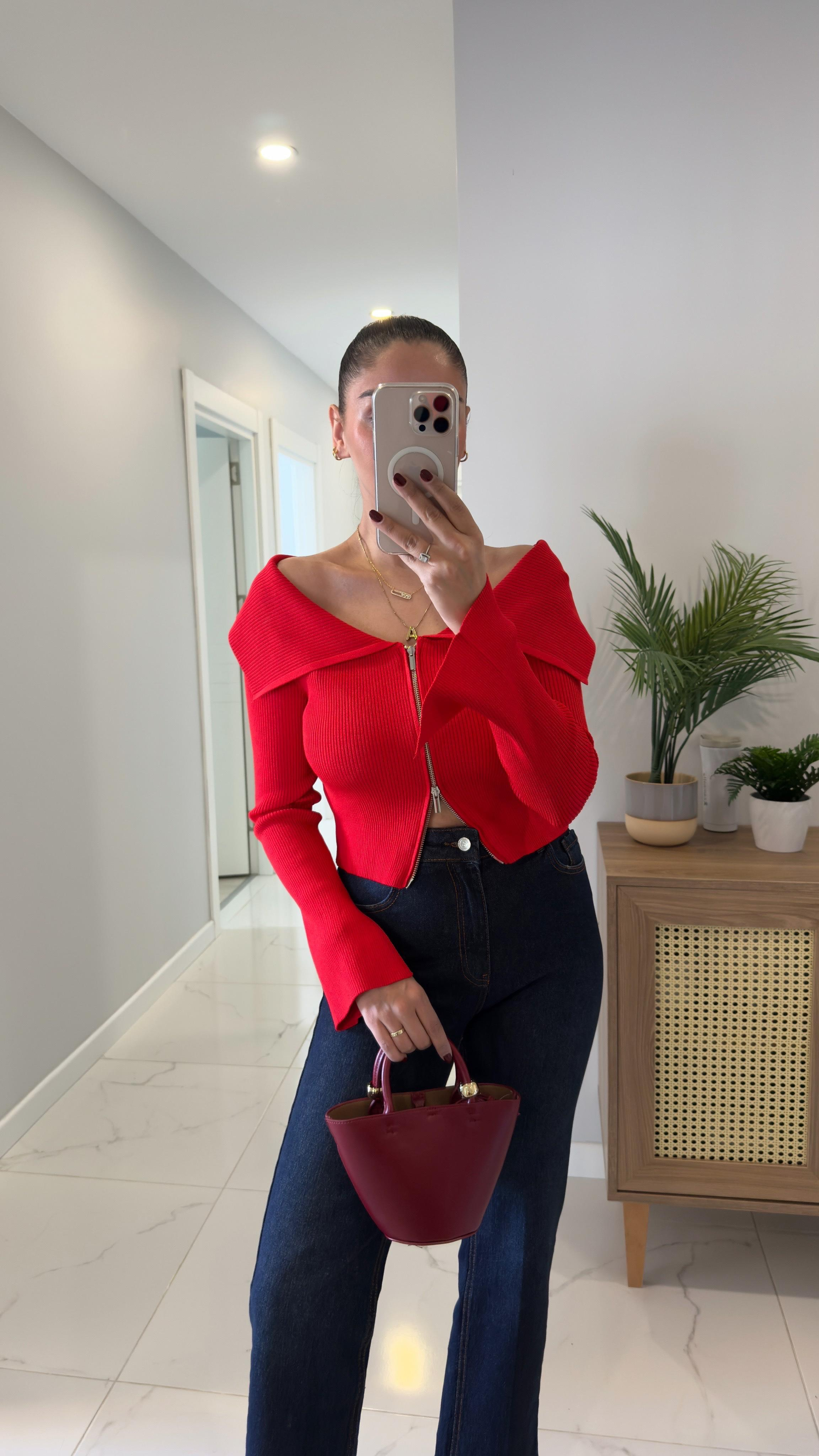 Dilvin Dos Kırmızı Kol Yırtmaç Detaylı Fermuarlı Hırka