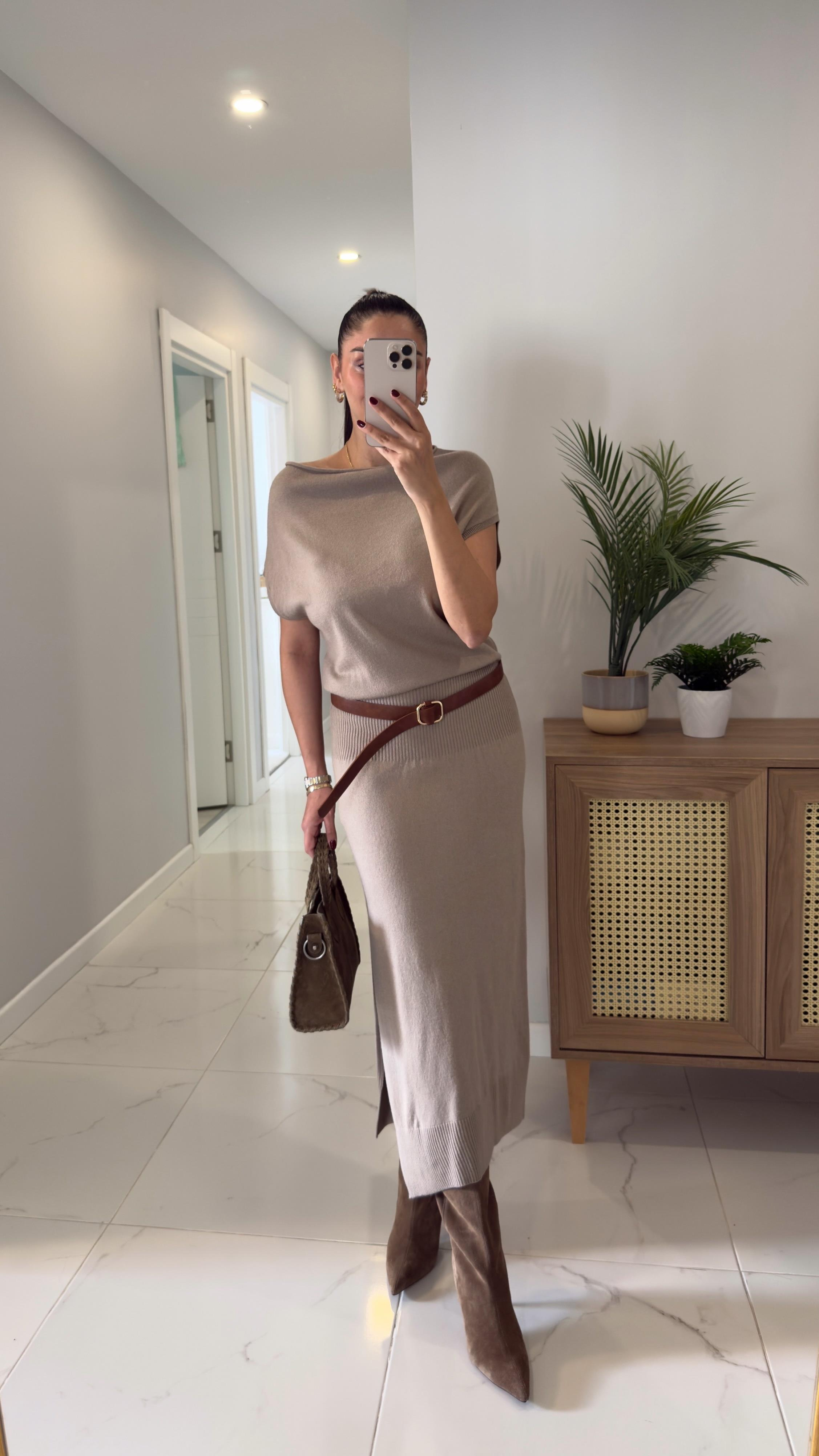 Dilvin Elas Koyu Vizon Asimetrik Yaka Kemerli Triko Elbise (ELB680-KYVZN)
