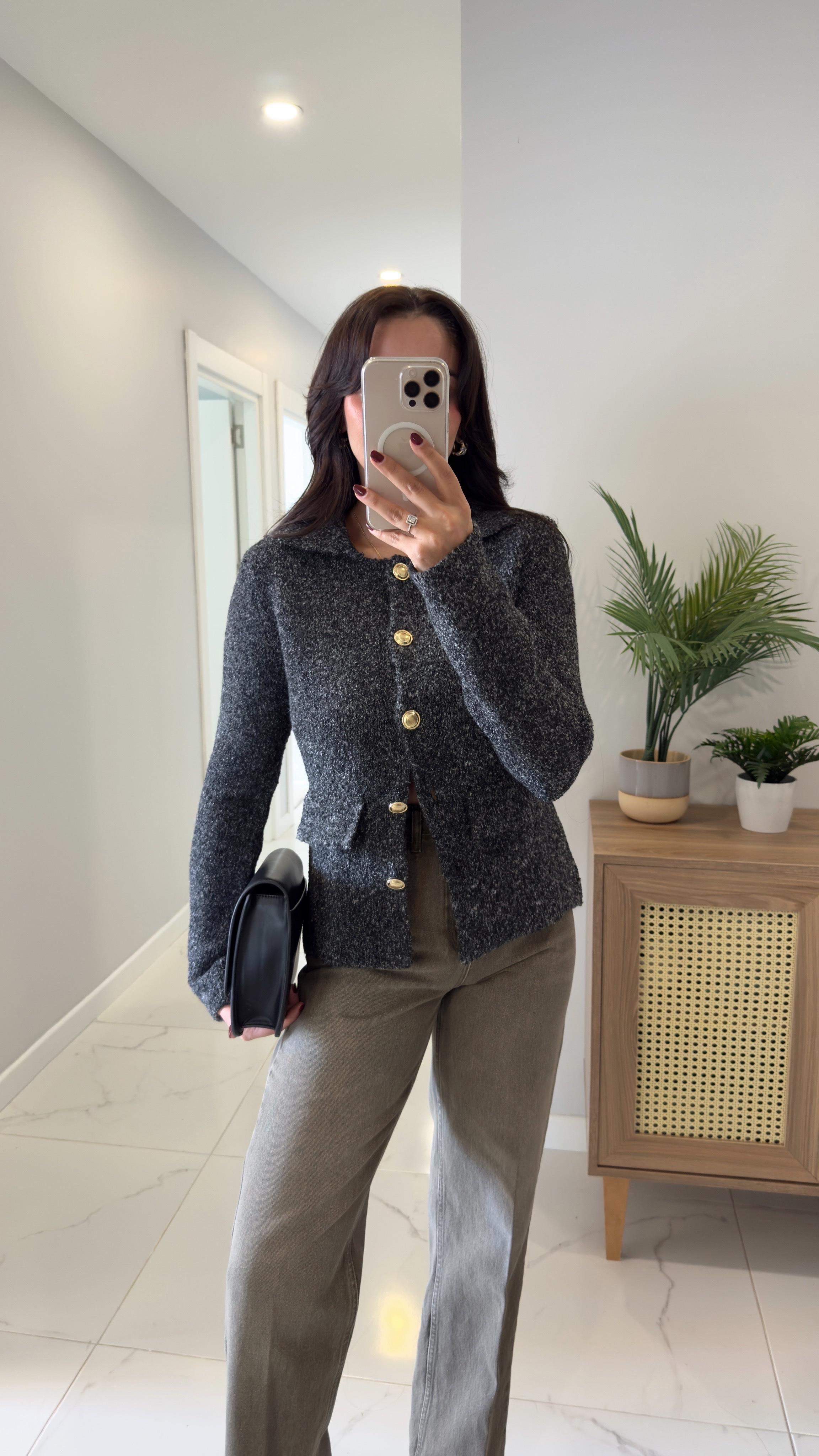 Dilvin Nos Antrasit Gold Düğmeli Cep Detaylı Hırka