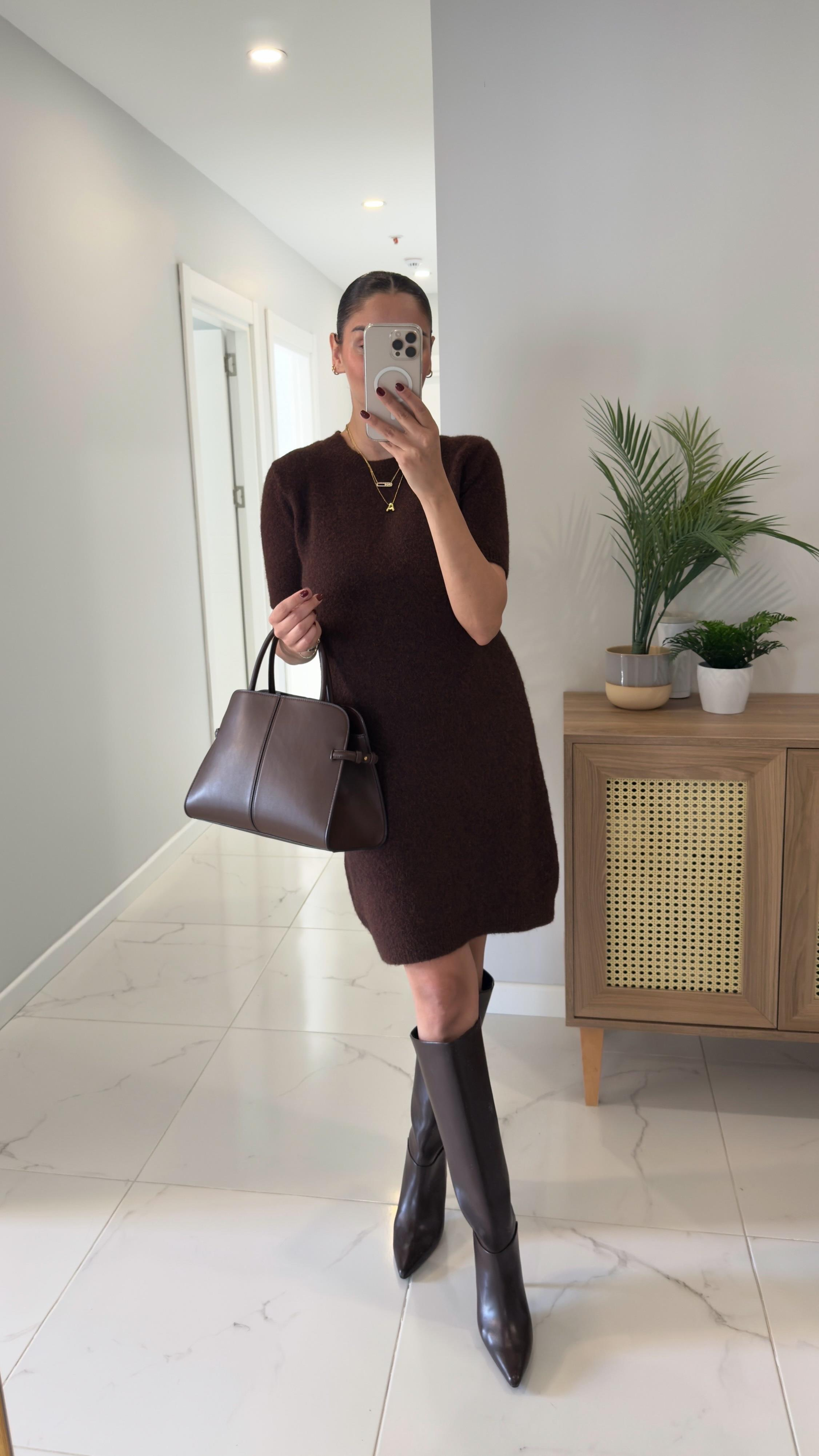Dilvin Nusa Kahve Melanj Kısa Kol Yumuşak Dokulu Elbise