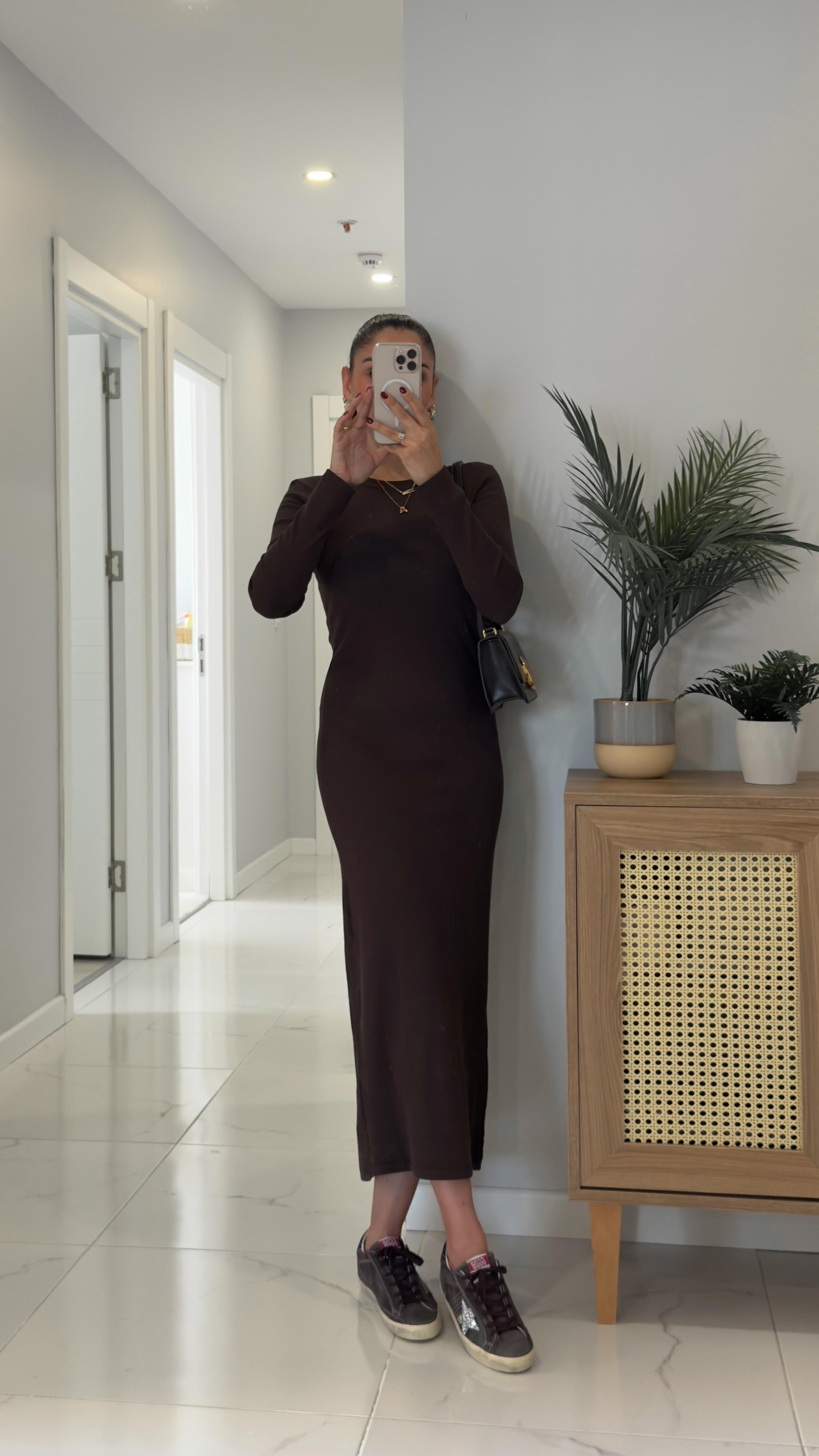 Gente Kahve Uzun Kol Fitilli Elbise