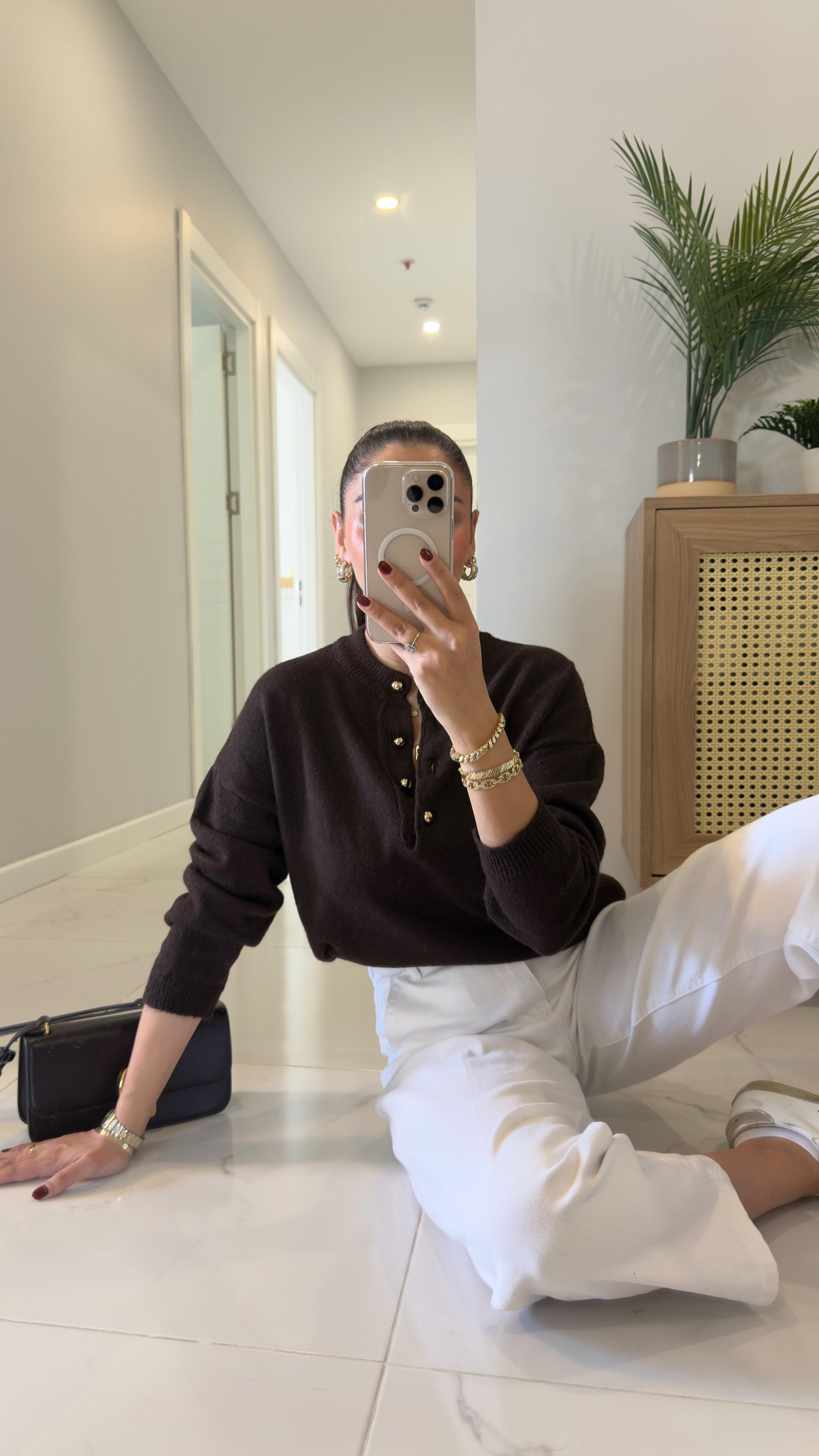 Jelly Koyu Kahve Gold Düğme Detaylı Triko