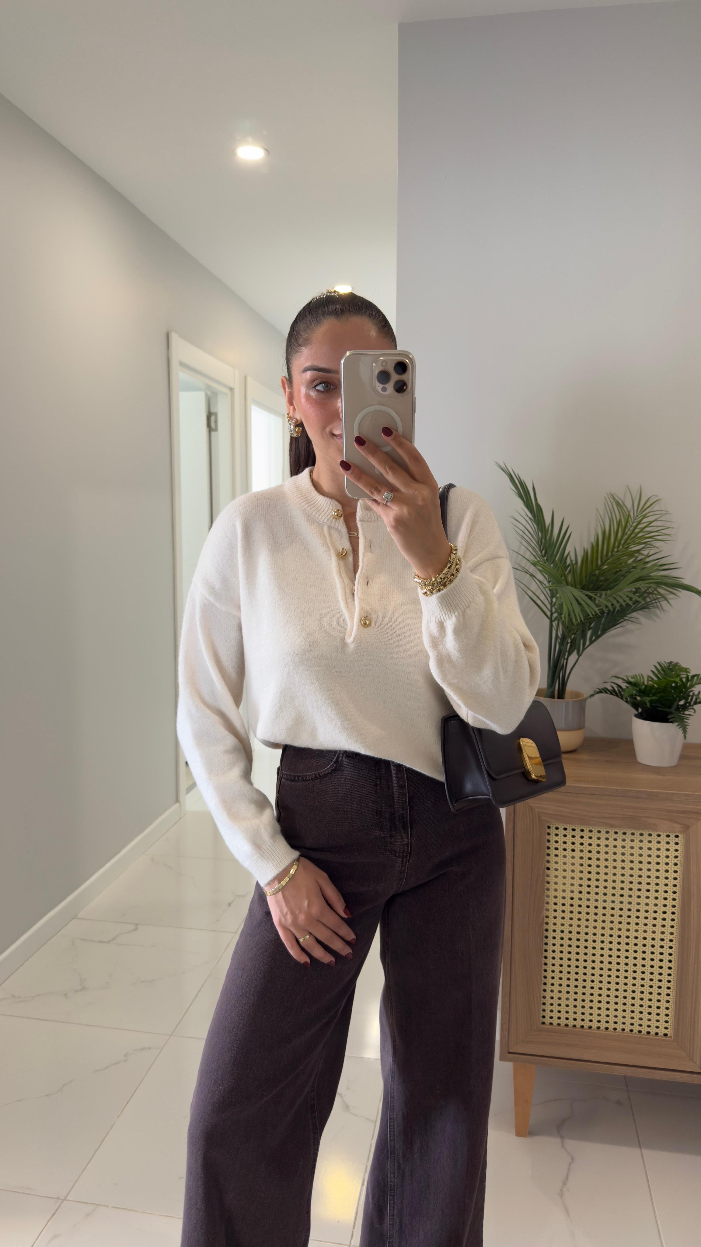 Jelly Krem Gold Düğme Detaylı Triko