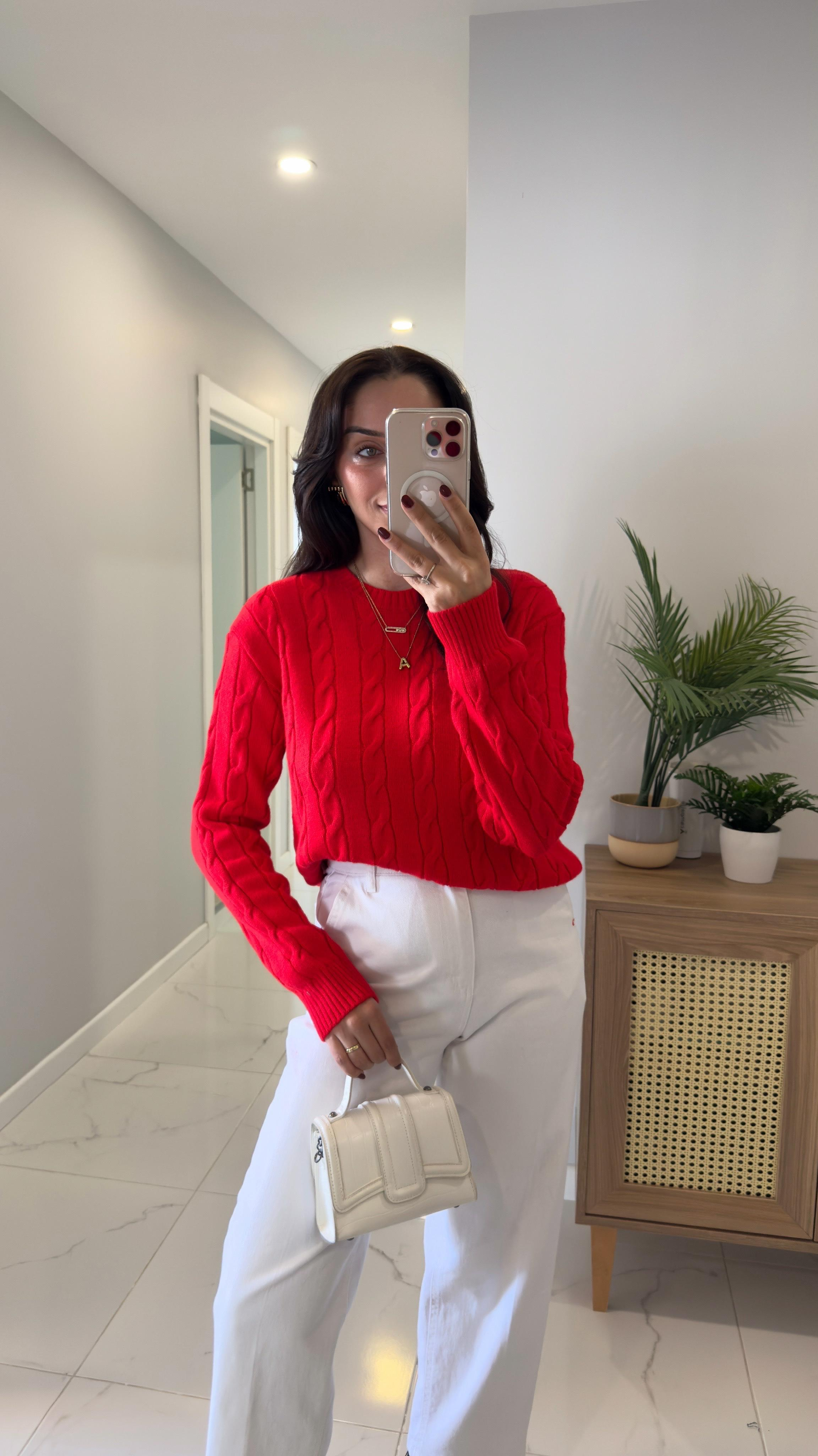 Kornas Kırmızı Saç Örgülü Triko Kazak