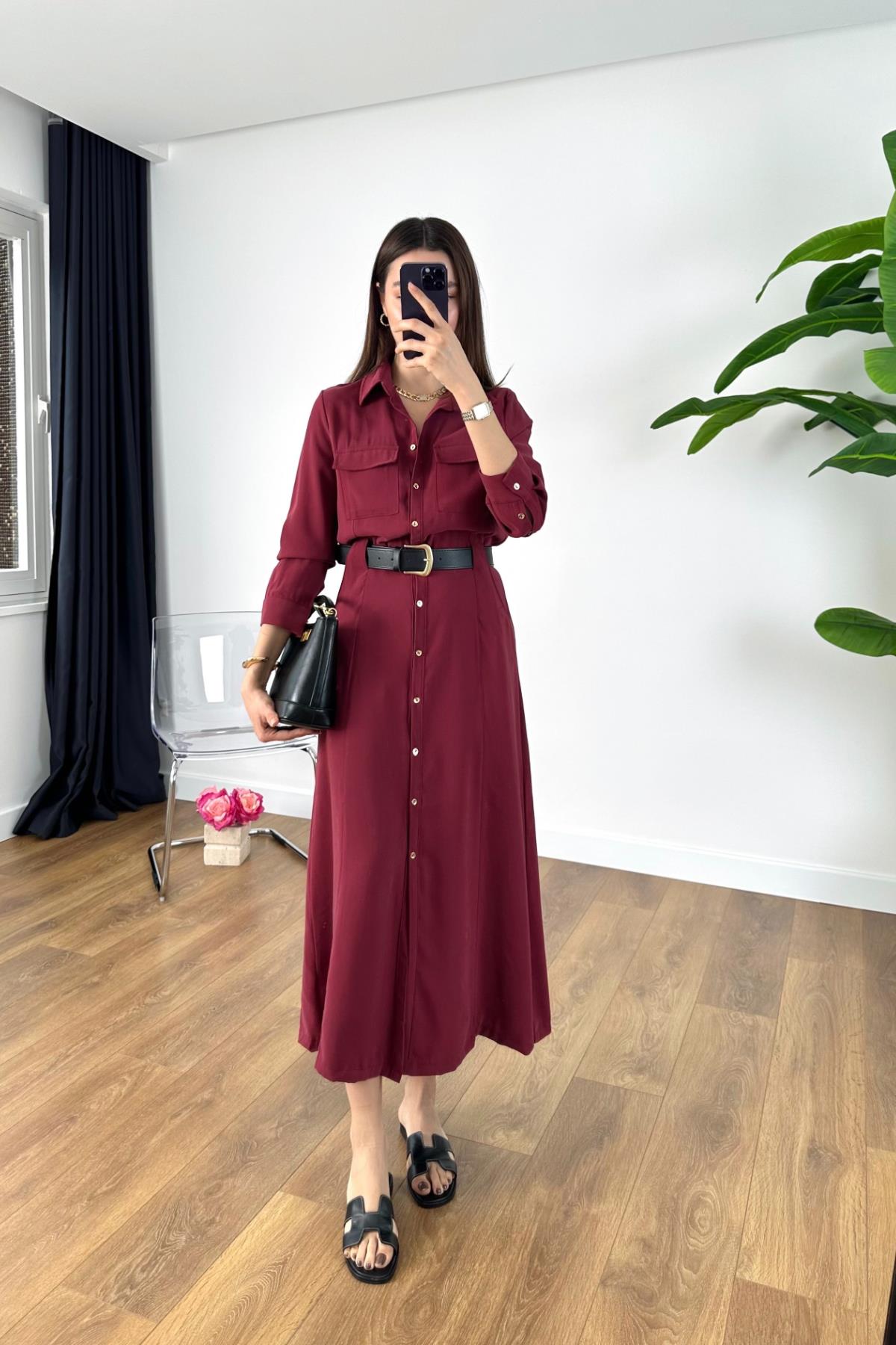 Losna Bordo Deri Kemerli Tensel Elbise (ELB497-BRD)