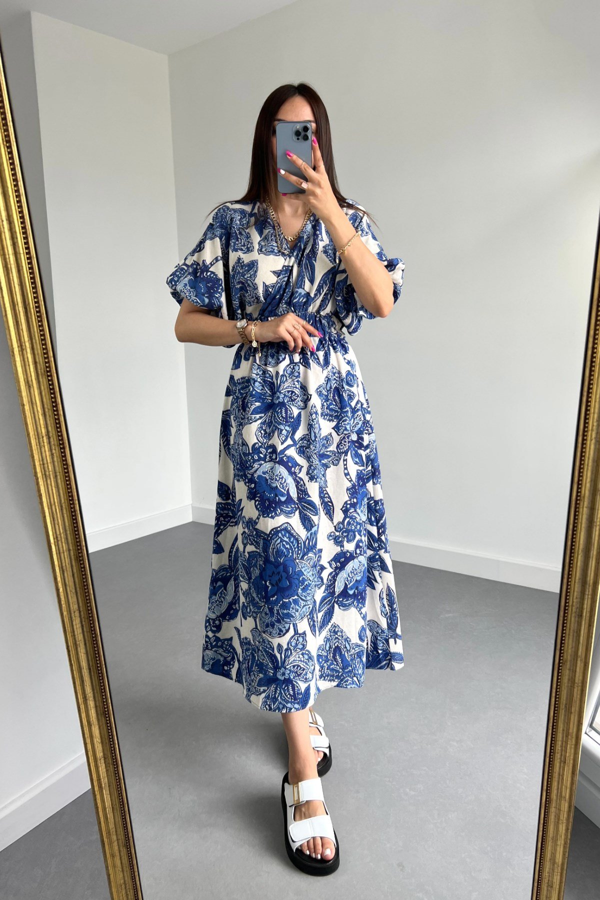 Mavi Kruvaze Yaka Keten Maxi Boy Elbise (elbise)