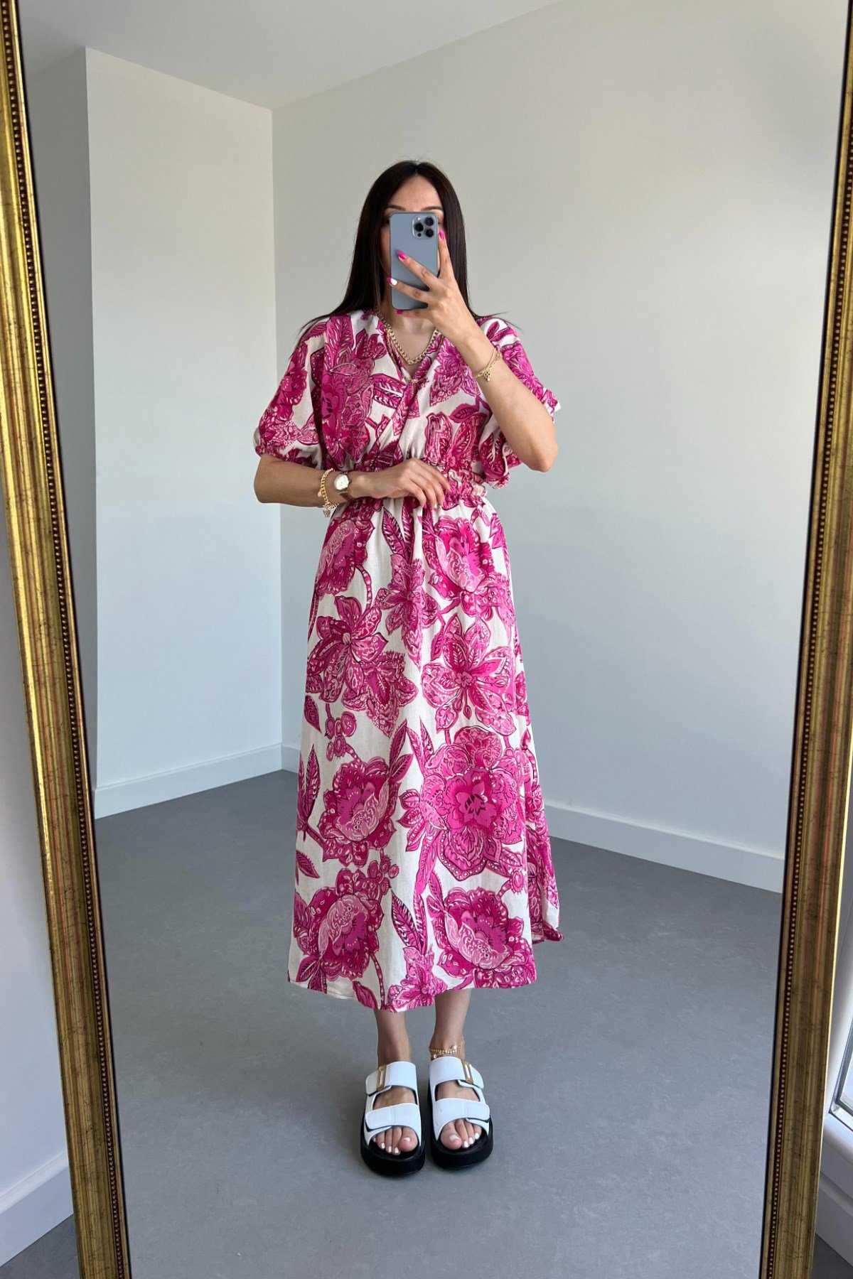 Pembe Kruvaze Yaka Keten Maxi Boy Elbise (elbise14)