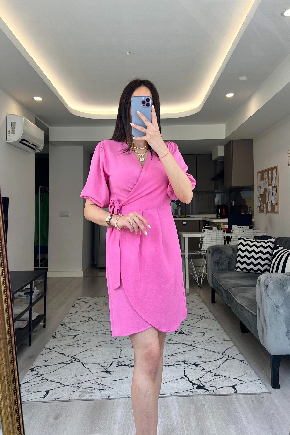 Pembe Kruveze Yaka Keten Elbise