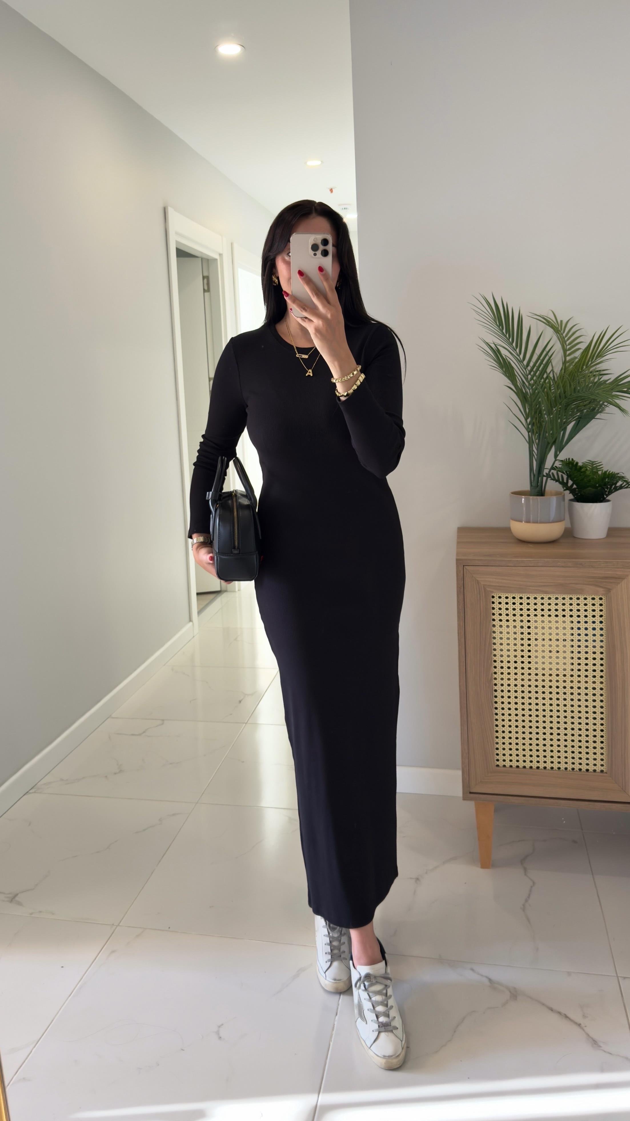 Ponne Siyah Uzun Kol Fitilli Elbise (ELB677-SYH)