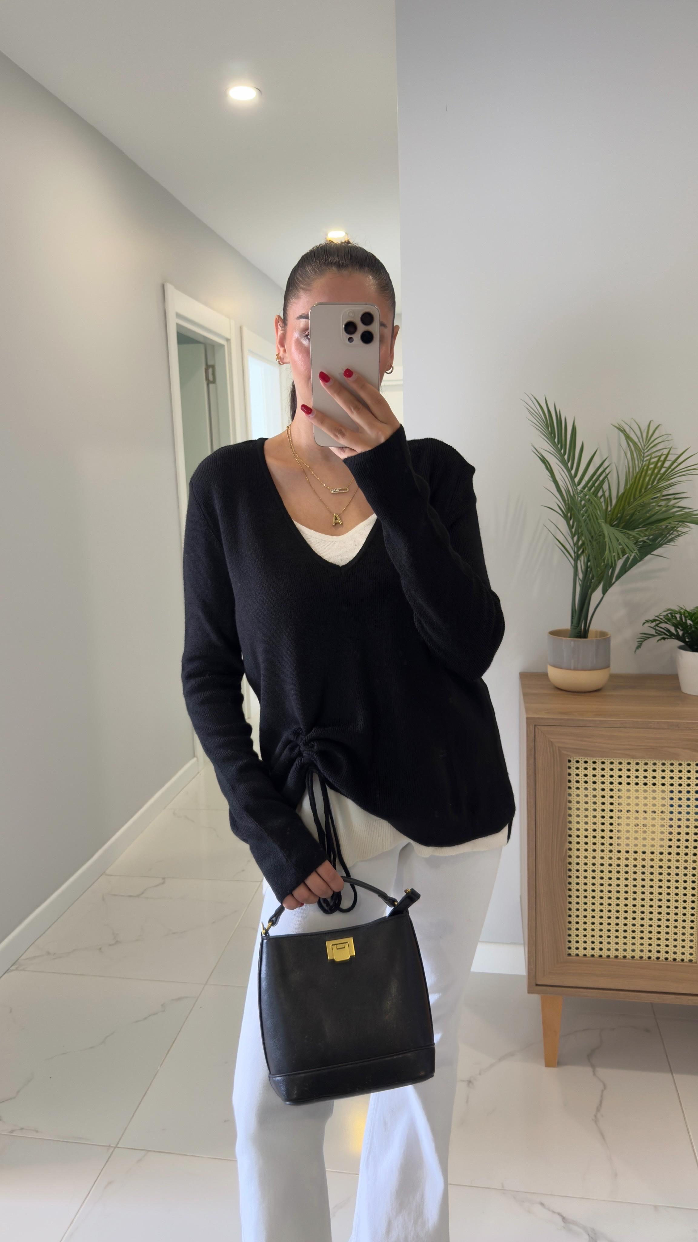 Romansa Siyah Krem Yandan Büzgülü V Yaka Triko (TRK551-SYHKRM)