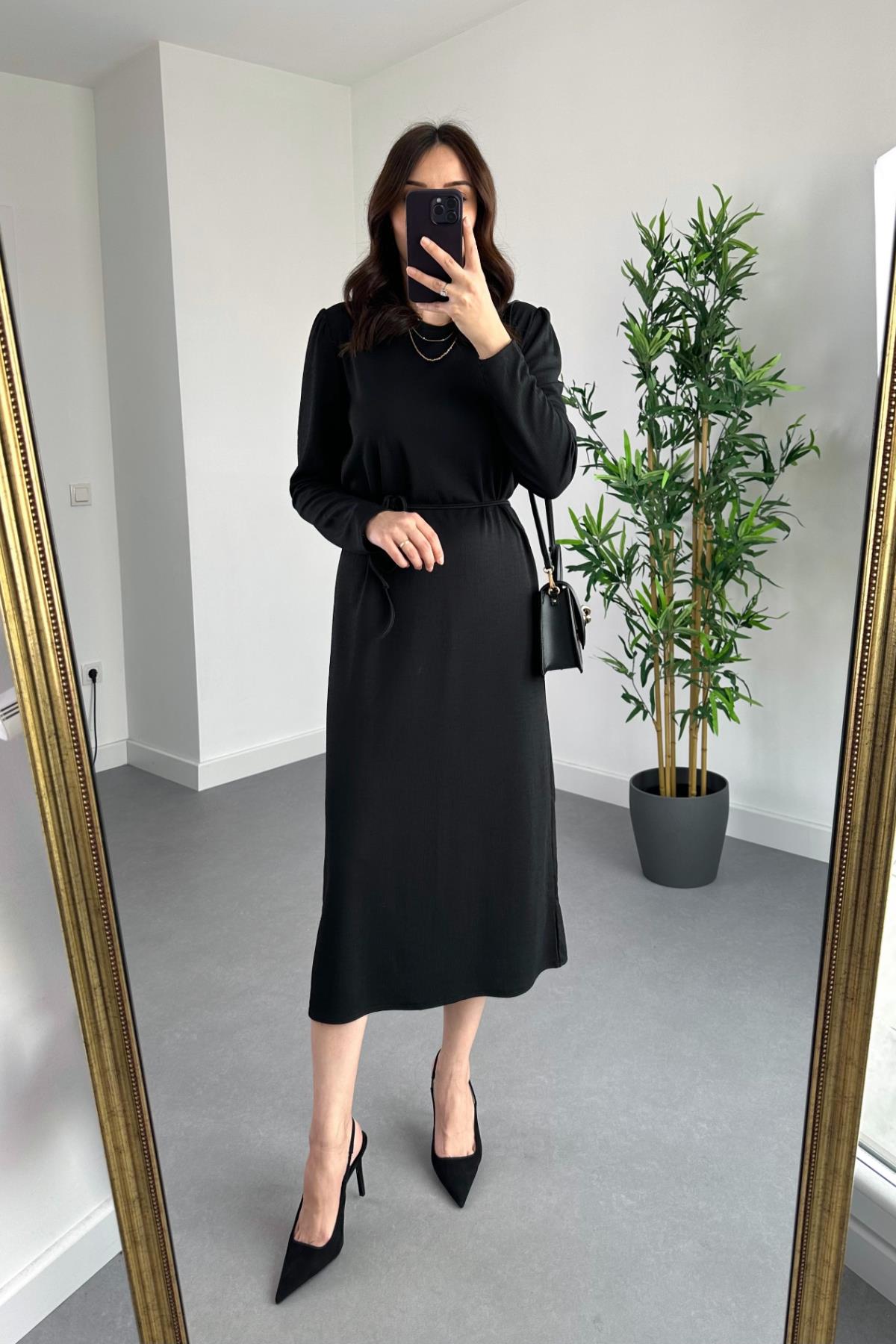 Siyah Bisiklet Yaka Dokulu Elbise (ELB015)