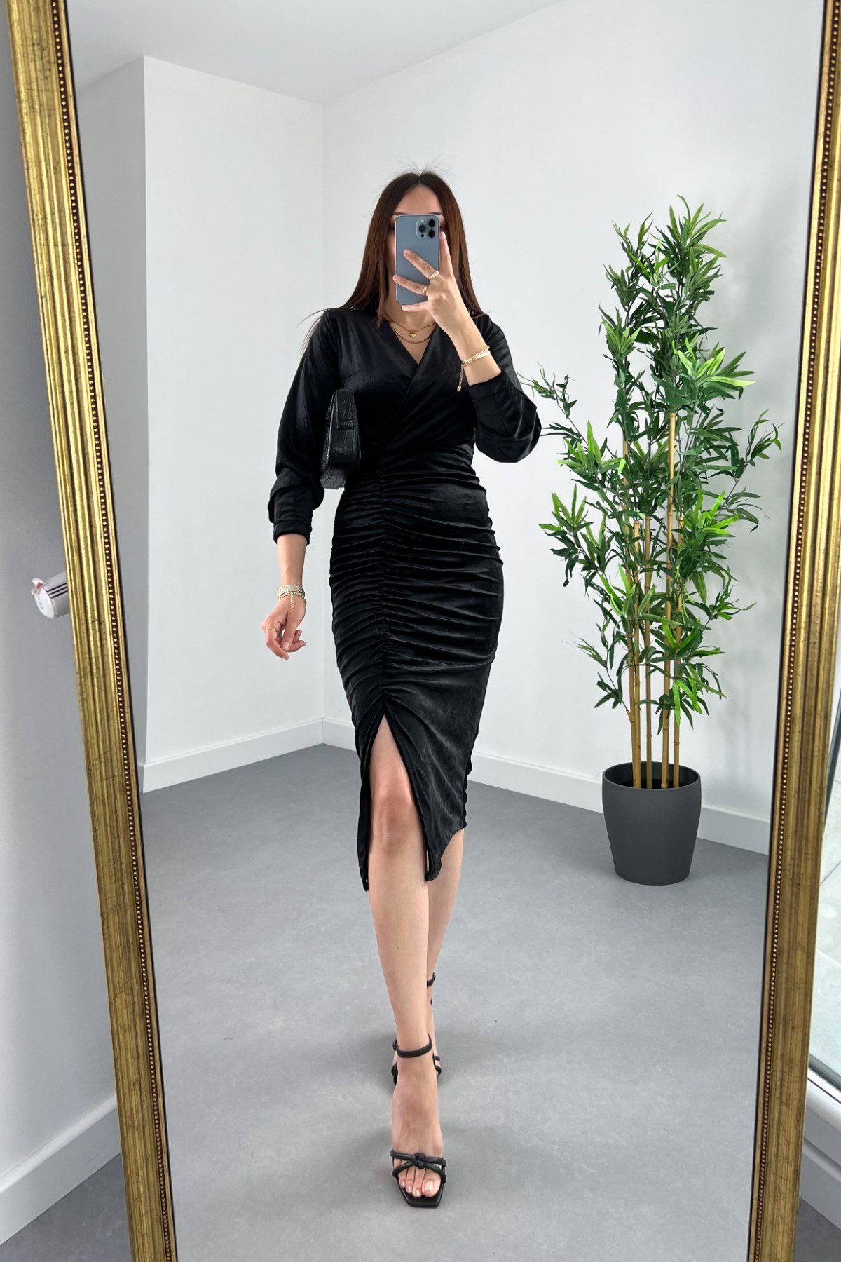 Siyah Kadife Dokulu Işıltılı Drapeli Elbise (elbise14)