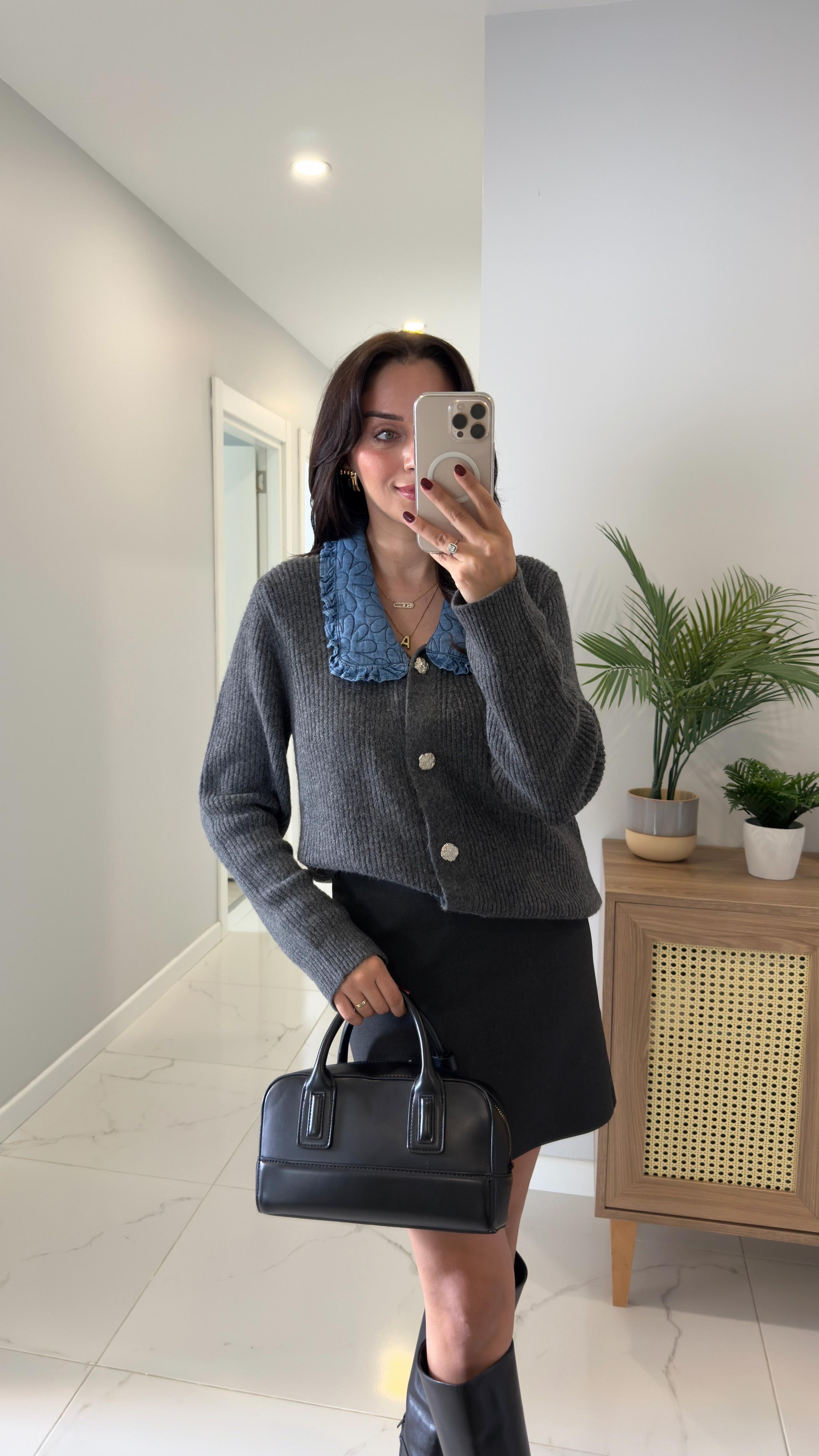Sonse Antrasit Mavi Yaka İşlemeli Hırka