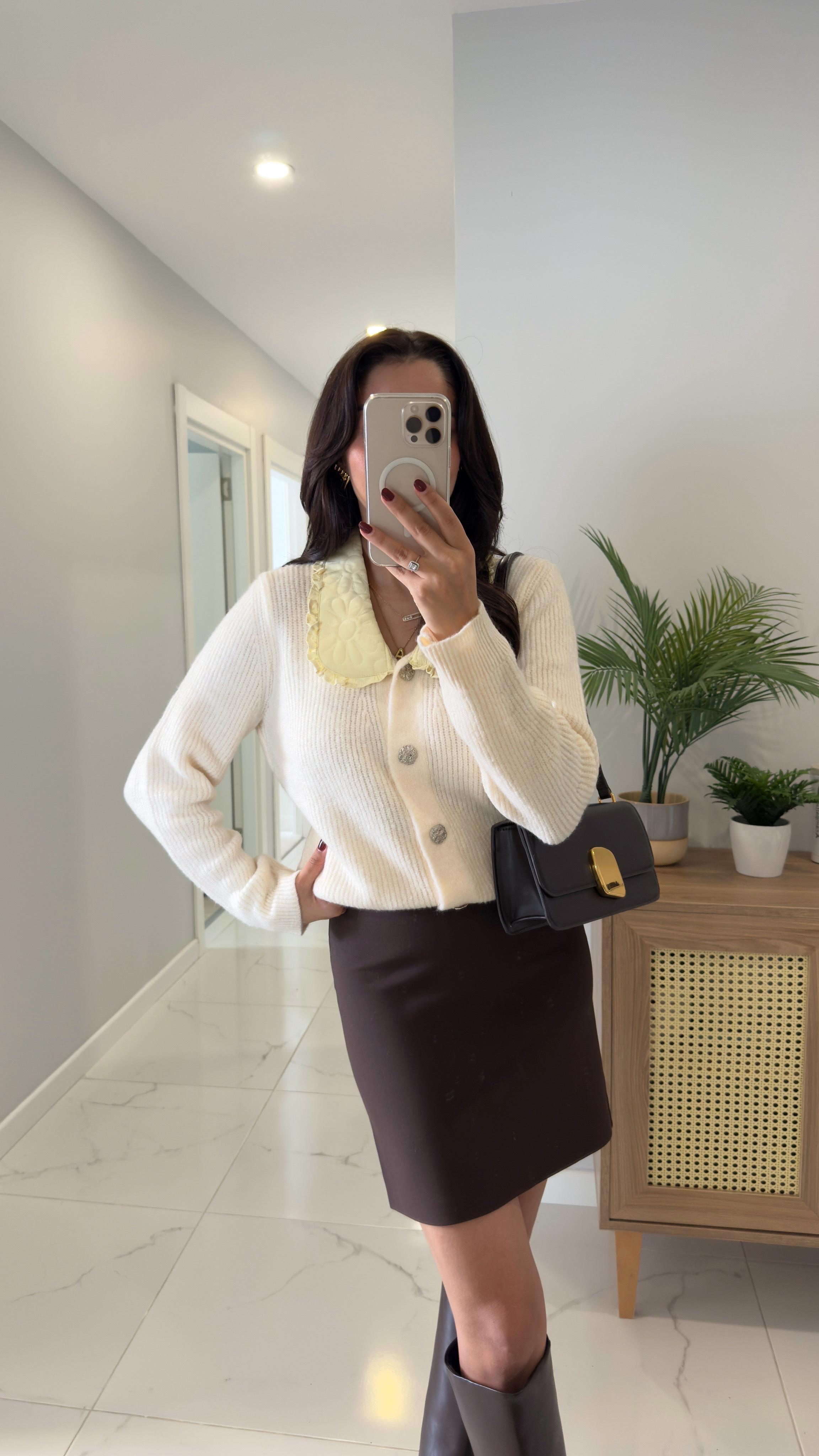 Sonse Krem Sarı Yaka İşlemeli Hırka