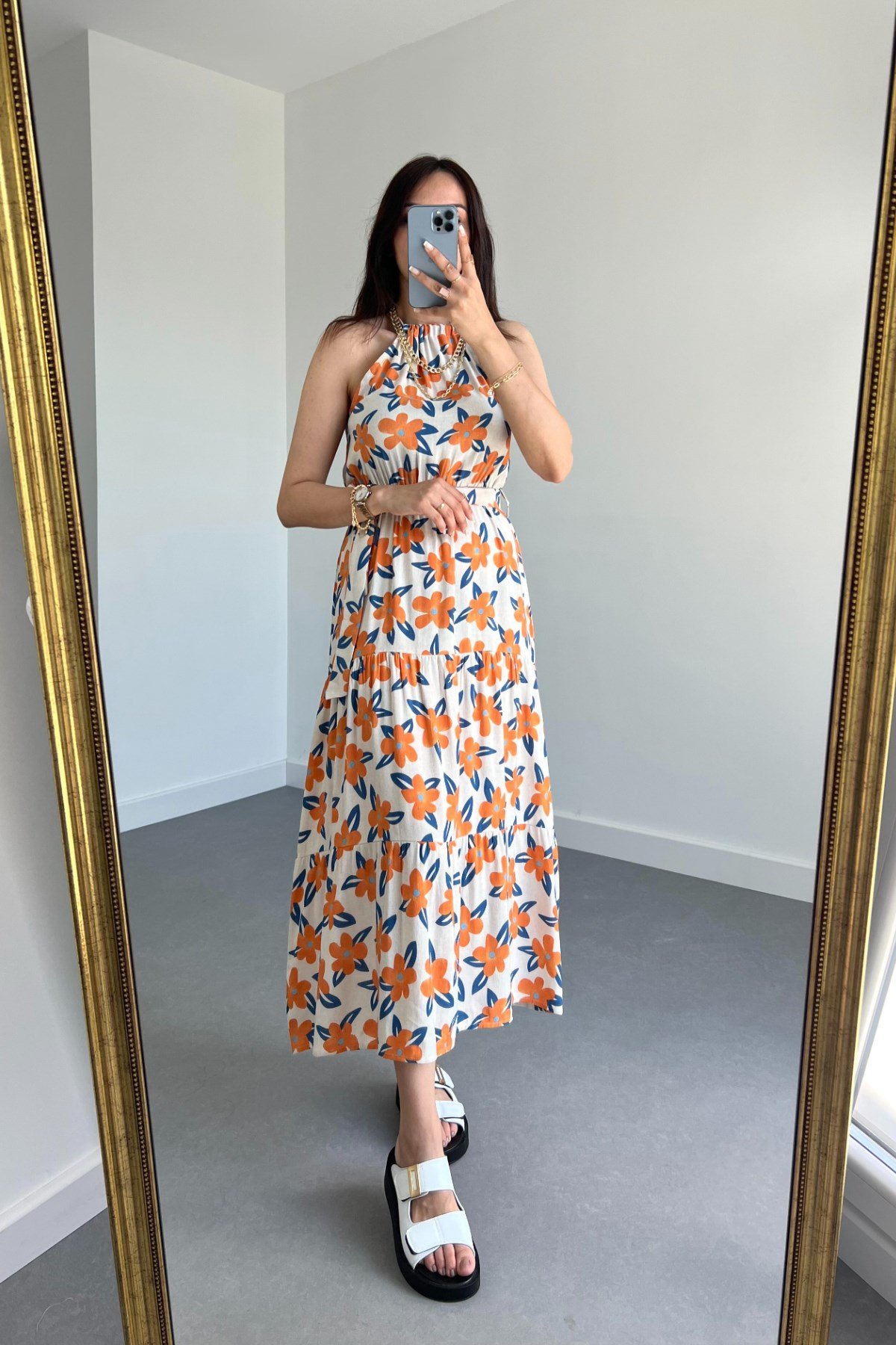 Turuncu Çiçek Desenli Keten Elbise (elbise)